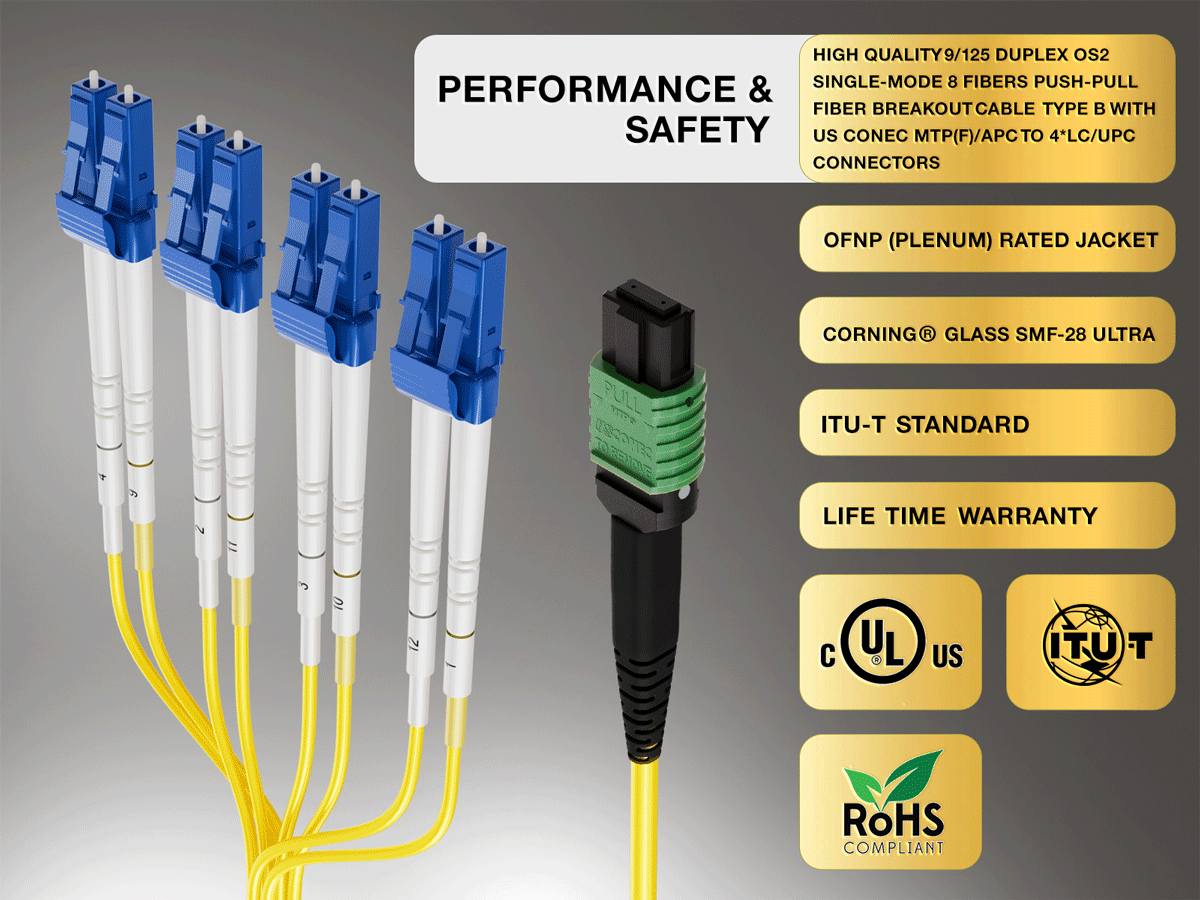 • High-Density Connectivity: The MTPĀ® OS2 push-pull breakout cable is engineered for high-density connectors and diverse cable configurations, offering an optimal solution for multi-fiber termination in compact network environments. This design promotes significant space savings and reduces installation and maintenance costs.