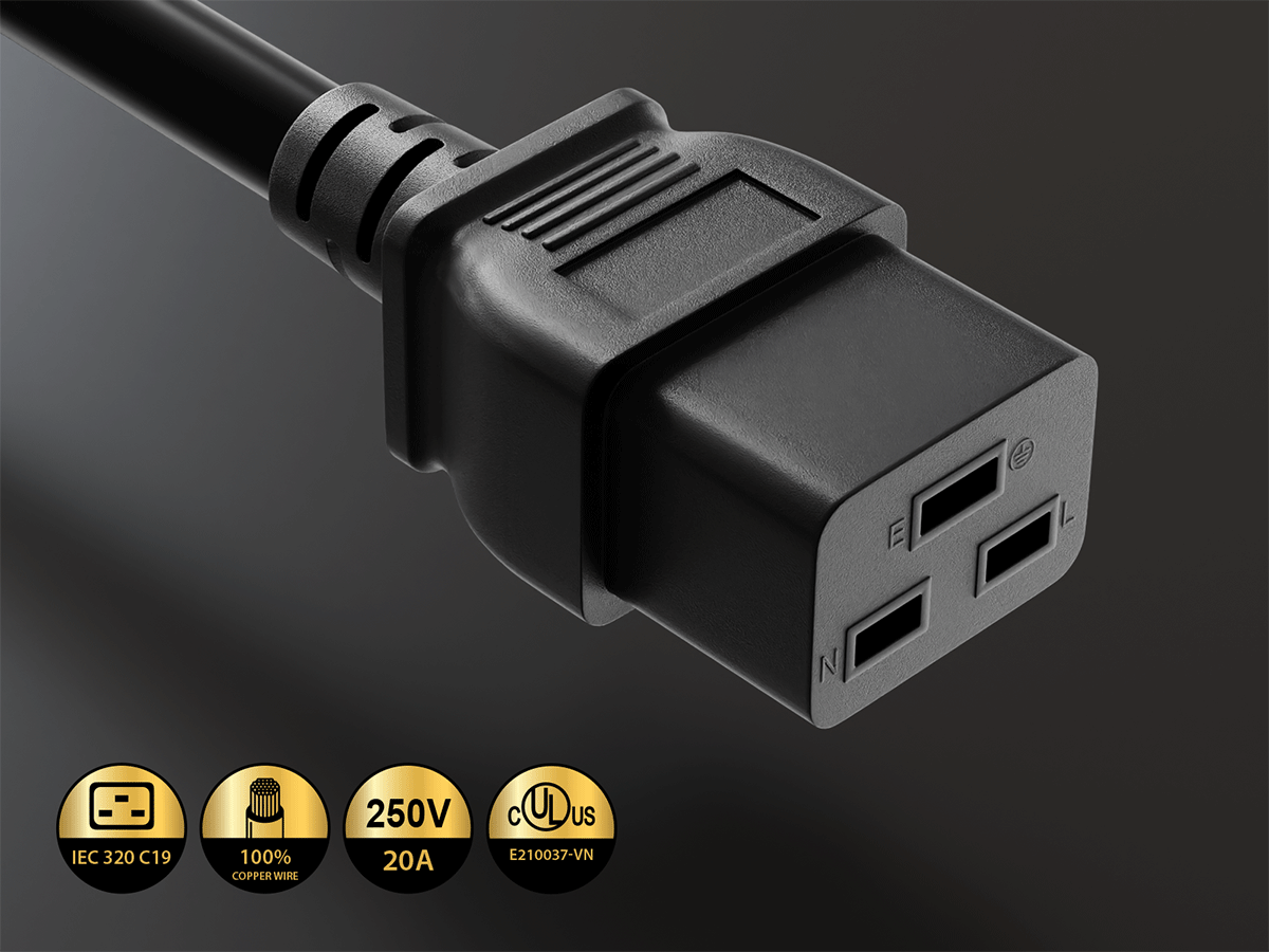 On the equipment end, the IEC-60320-C19 connector provides a secure fit into compatible devices such as high-powered servers, UPS systems, PDUs, and networking equipment with C20 inlets. The C19 connector is rated for higher amperage than standard C13 connectors, making it suitable for devices with substantial power requirements.